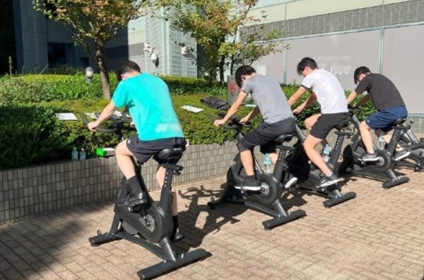 まず、運動時の日やけと疲労の関係を明らかにするための試験を行いました。試験に同意した健康な男女20名に、半そで半ズボンの日やけをしやすい服装で屋外にてフィットネスバイクを漕ぐ規則運動を120分間行ってもらいました(図2)。この際、紫外線保護メガネを着用してもらうことで、目からの紫外線の影響を除外しています。同様の試験を日の当たらない屋内でも実施しました。