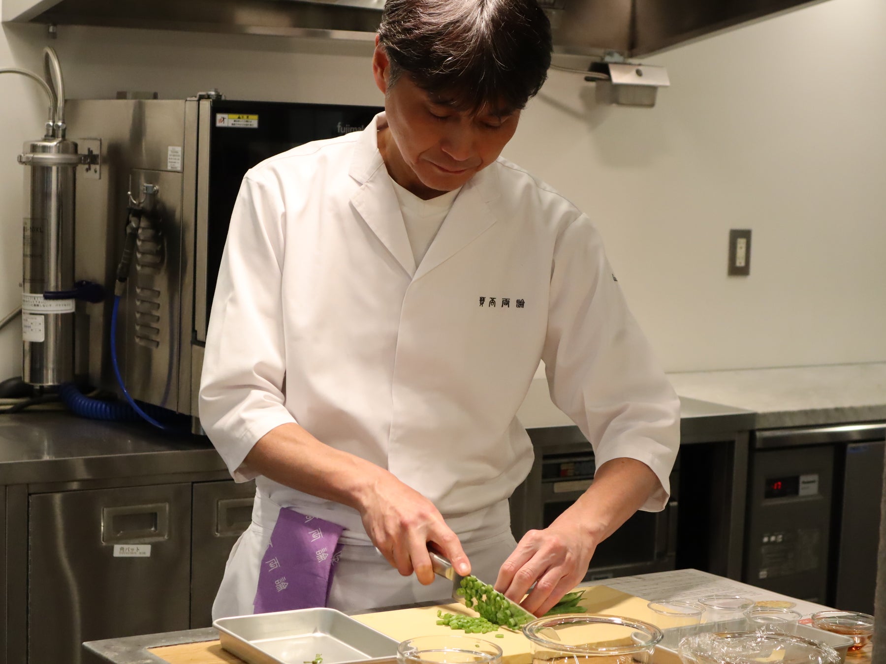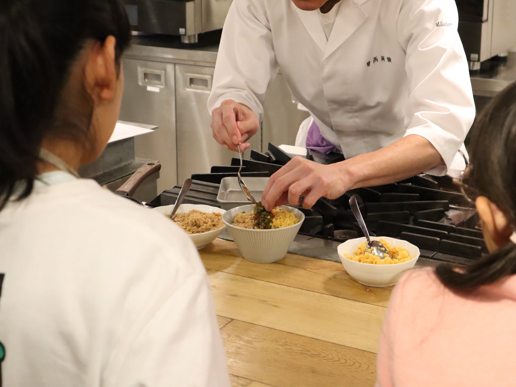 今回の親子料理教室イベントは、和食の魅力を子どもたちにも伝えたいという想いから開催。多くの応募者の中から抽選で選ばれた8組16名様を招待。今回のコラボメニューの中から、大人からお子様まで愛される和食の定番メニュー「鶏そぼろ三色丼」を笠原氏から直接教わることができるという料理体験が実現しました。