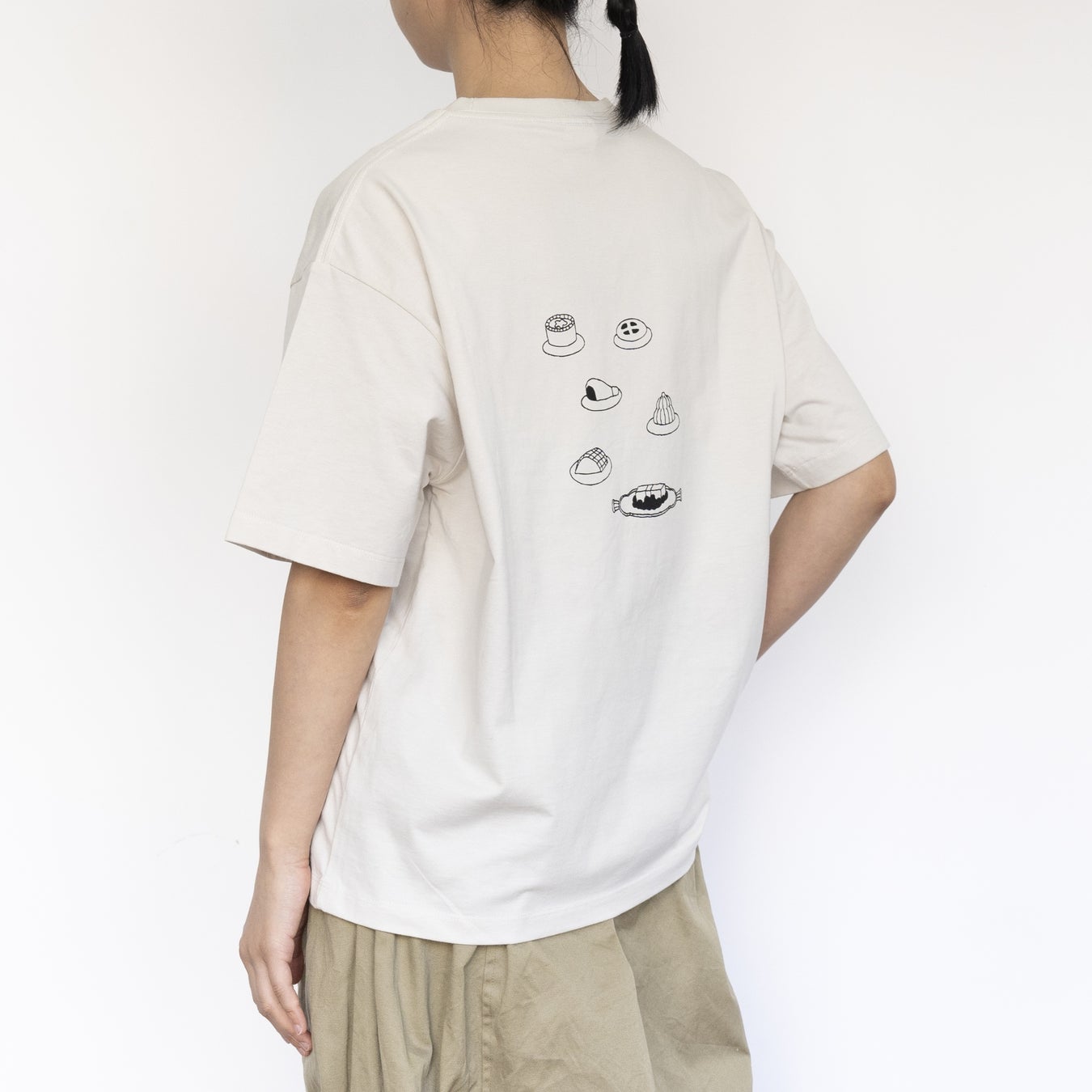 フロントには木彫りの私と、犬が横に並んでいるシーン。バックプリントには美味しそうな石膏の食べ物たち。