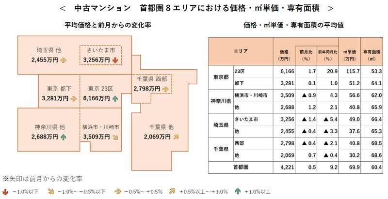 ●首都圏の中古マンション1戸あたり平均価格は4,221万円。前月比、前年同月比ともに6カ月連続で上昇。