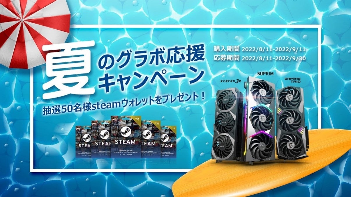 エムエスアイコンピュータージャパン株式会社は、8月11日(木)から対象のMSI製グラフィックスカードを購入していただいた方の中から抽選で50名様に100ドル相当のSteamウォレットコードをプレゼントする「夏のグラボ応援キャンペーン!」を開催いたします。