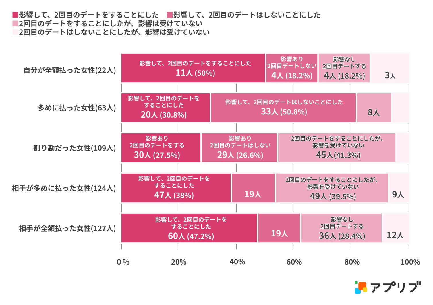 「初回デートで自分が多めに払った」女性の82人のうち37人(43.5%)は「影響して、2回目のデートをしないことにした」と回答。一方で31人(36.5%)の人、特に全額支払った女性の50%は「初回デートの支払いが影響して、2回目のデートをすることにした」と回答しています。