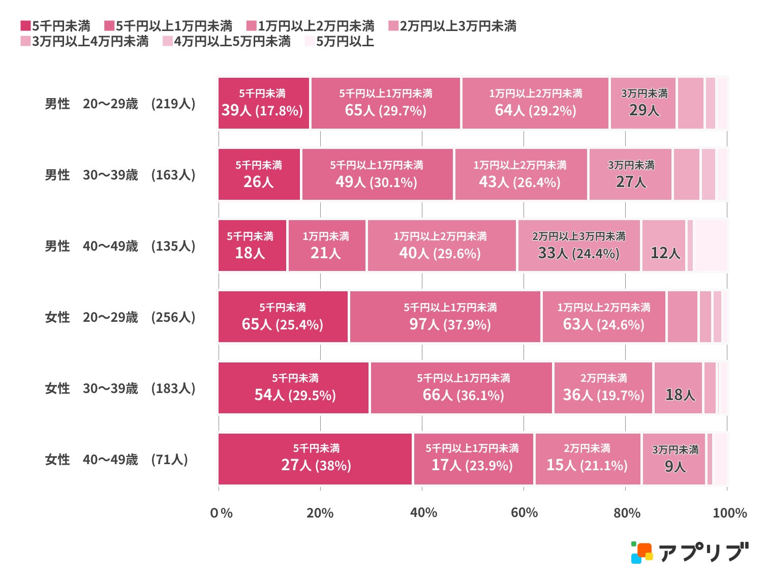 男性を年代別に見ると、20代男性は1万円未満の割合が47.5%であるのに対し、40代男性は28.9%と年齢を重ねるごとに予算が増えていく傾向にあります。