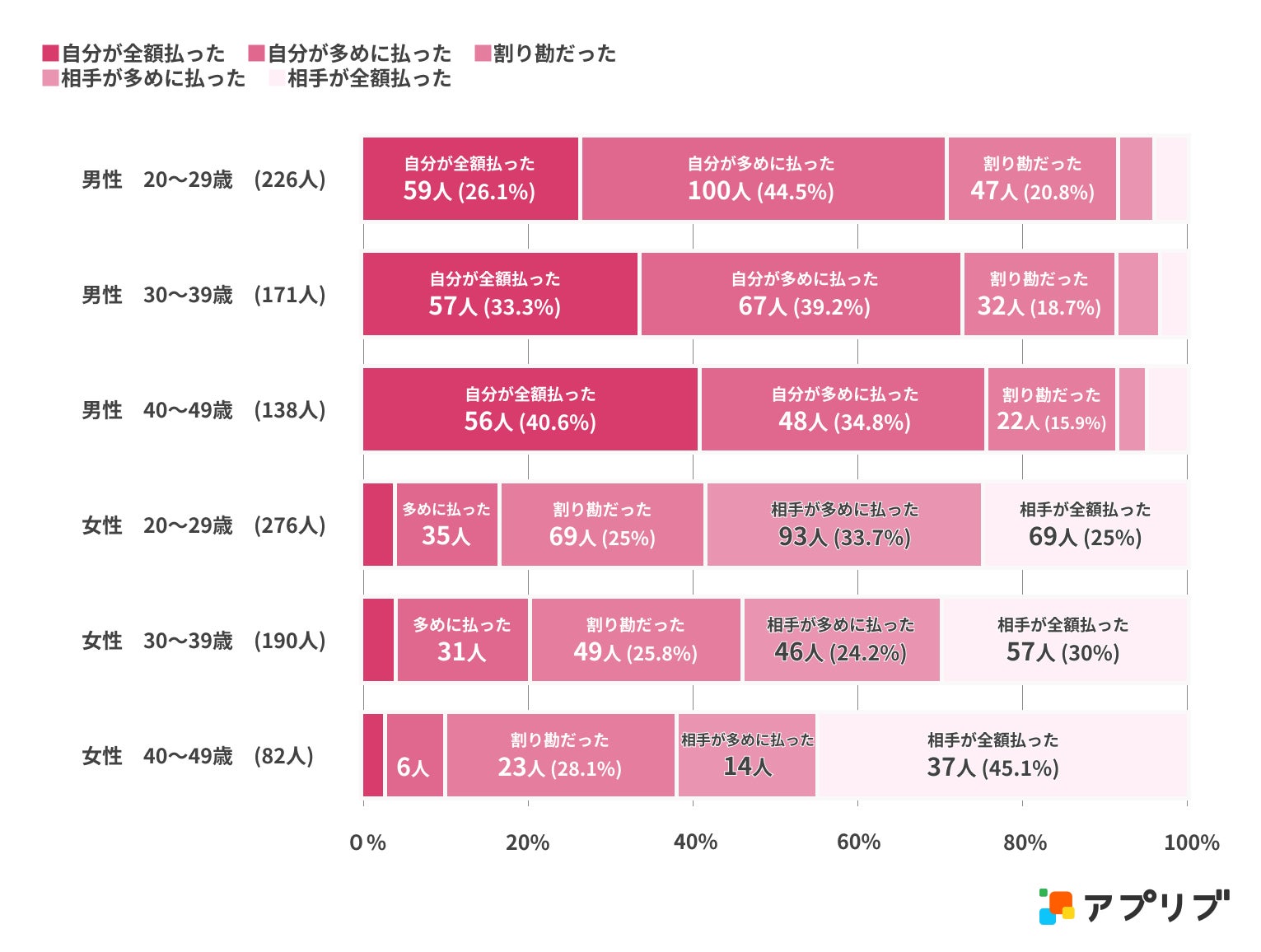 40代女性の45.1%(82人中37人)は「相手が全額払った」と回答し、ひときわ高いことが特徴的な結果となりました。