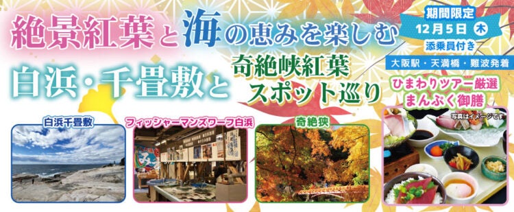 年末大感謝祭!!ポイントカード2倍押しキャンペーンお一人様9,800円!〈大阪駅・天満橋・なんば発着〉12月5日(木) 絶景紅葉と海の恵みを楽しむ白浜・千畳敷と奇絶峡紅葉スポット巡り。〈添乗員付き〉日帰りバスツアーのオンライン販売を開始しました。