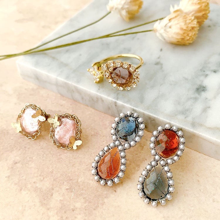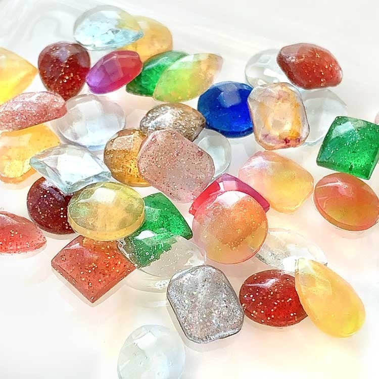 新発売の「シリコンレジン型 / エポ石風 6種」は、エポキシ樹脂で作られたビジューのようなツヤ感がでるモールドです。こちらは実際にあるエポキシ樹脂パーツを模して作成しており、使いやすいサイズ、形がポイントであり、 寄せ物や側面にもカットがあるので様々なデコレーションアクセサリーにアレンジが可能です。
