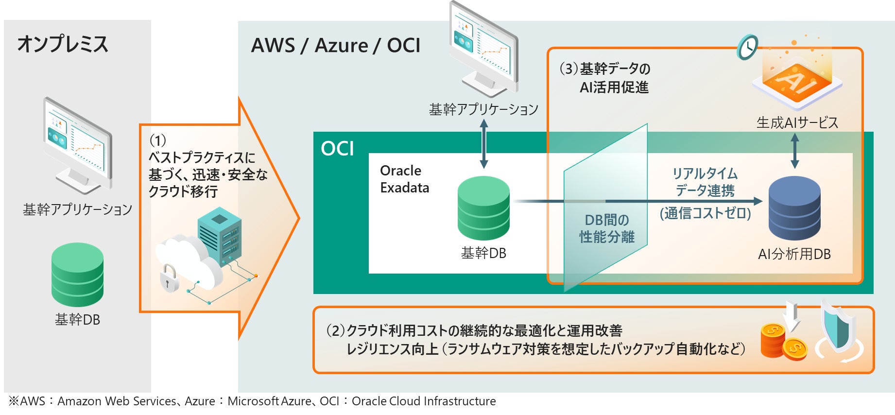 本サービスは、下図に示す通り、基幹DBがもつ重要な業務データの信頼性・安全性を確保しながら、クラウドへ迅速に移行し、継続的なコスト最適化やAIによるリアルタイムデータ活用を可能にします。