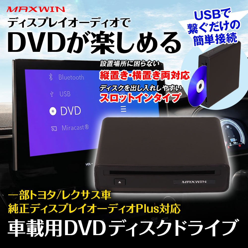 カー用品ブランドMAXWIN(運営:昌騰有限会社、所在地:大阪府泉大津市)は、純正ディスプレイオーディオのUSBポートに接続するだけでDVDを再生することができる『DA-DVD03』の発売を開始いたします。縦置きにも対応しているためコンソールボックスに収納することが可能です。さらに設置後もDVDディスクの出し入れが簡単なスロットイン式で、続きから再生するレジューム機能に対応したDVDプレーヤーです。