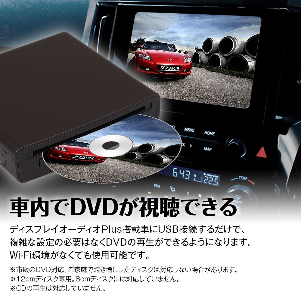 ディスプレイオーディオPlus搭載車にUSB接続するだけで、複雑な設定の必要はなくDVDの再生ができるようになります。Wi-Fi環境がなくても使用可能です。