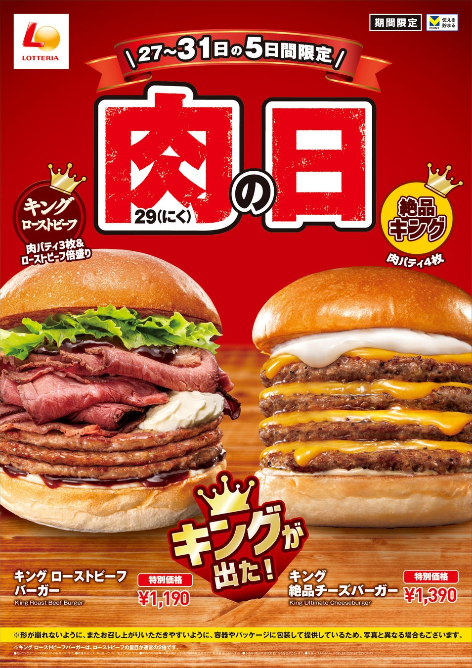 株式会社ロッテリア(代表取締役社長:長久保 文康 本社:東京都港区)が展開するハンバーガーショップ「ロッテリア」は、12月27日(金)から12月31日(火)までの5日間限定で、食べ応え抜群なキングサイズのバーガーをお得な価格でお楽しみいただける「ロッテリア 肉(29)の日」を開催します。