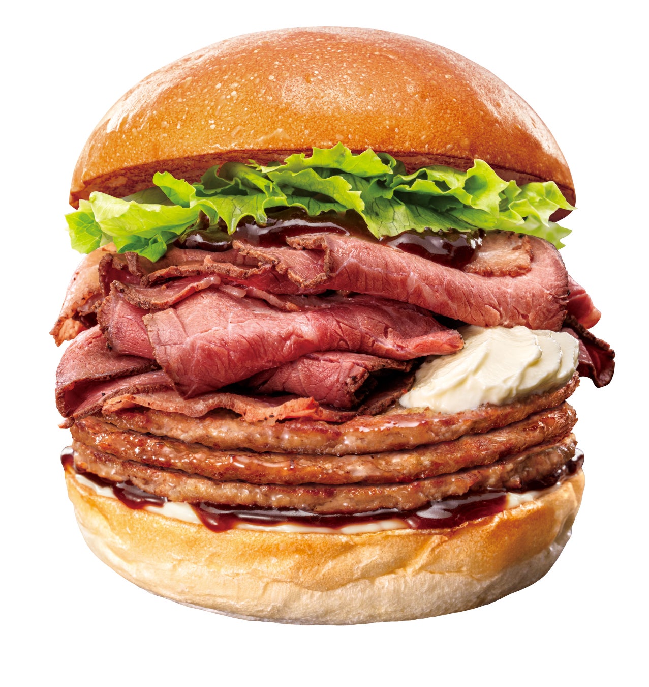商品概要:3枚重ねたハンバーグパティに、「ローストビーフバーガー」の約2倍の量のローストビーフを合わせた贅沢なバーガーです。ツンとした辛さが特長のホースラディッシュソース、爽やかな酸味のサワークリームが牛肉の旨みを引き立てます。1年の締めくくりにぴったりな贅沢な味わいの一品をご堪能ください。
