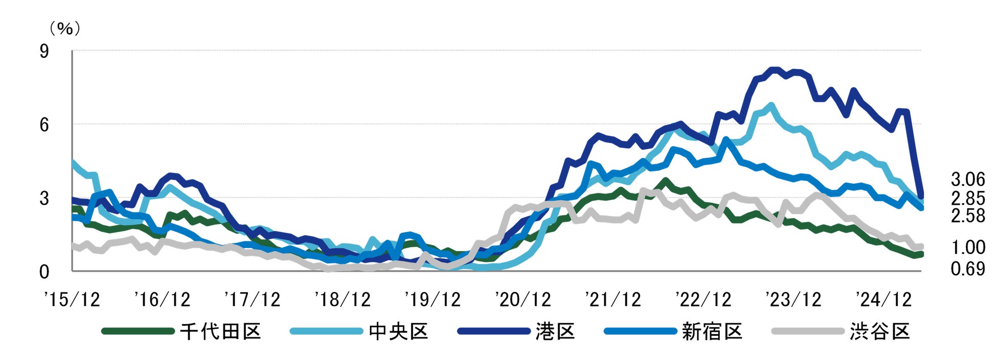 空室率 2ヵ月連続で大幅な低下 港区の新築・築浅ビルを中心に空室消化が進む