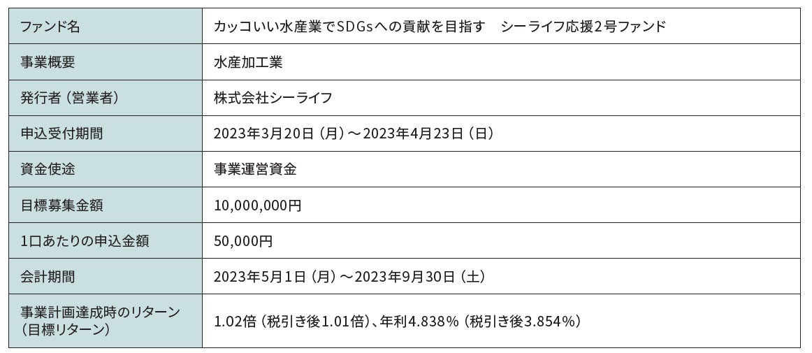 Sony Bank GATEでは、当事業を含む事業運営への出資を1口50,000円、目標募集金額10,000,000円で募集します。好評だった2022年の1号ファンドに続く、2度目の募集になります。