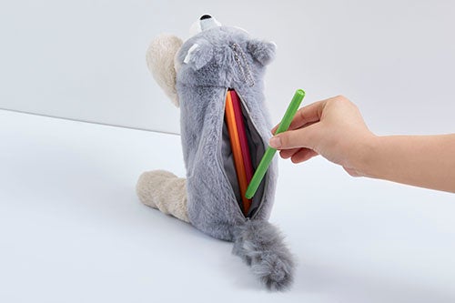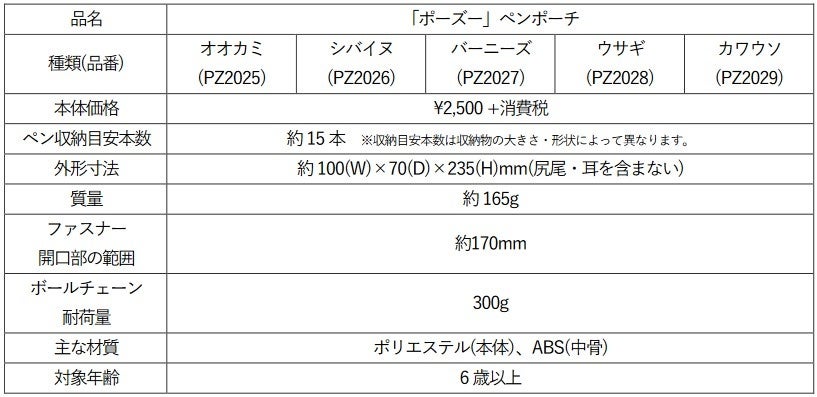 2022 年 6 月の発売の「ポーズー」ペンポーチ第 1 弾は、見た目の愛らしさと機能性が高く評価され、SNS やメディアでも多く取り上げられたほか、文房具屋さん大賞 2023(扶桑社)筆箱賞で第 1 位を受賞し、年間目標販売数を 120%達成ペースで推移しています。今回発売の第 2 弾では、お客様アンケートの結果を踏まえ、ご要望を多くいただいた動物が仲間入りしました。ラインアップはオオカミ、シバイヌ、バーニーズ、ウサギ、カワウソの 5 種類で、手や尻尾の形をそれぞれの動物に合わせたこだわりのデザインです。