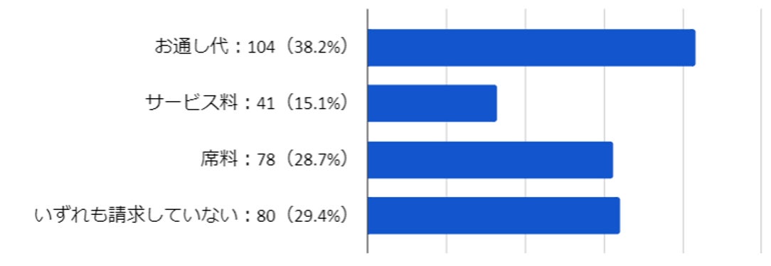お通し代やサービス料の発生する業態を運営していると回答した人に対し、会計時の請求に含まれる項目について聞いたところ(複数回答可)、「お通し代(38.2%)」、「サービス料(15.1%)」、「席料(28.7%)」、「いずれも請求していない(29.4%)」、という回答になりました。