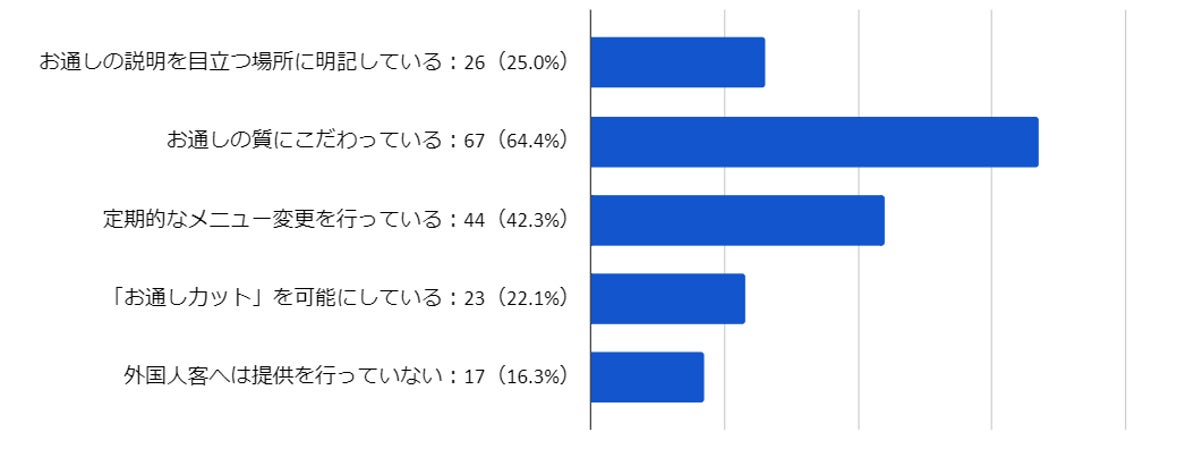 次に、お通しを提供している店舗に対し、「お通し」を提供する上で実施していることについて聞いたところ、64.4%が「お通しの質にこだわっている」と最多の回答。続いて、42.3%が「定期的なメニュー変更を行っている」、25%が「お通しの説明を目立つ場所に明記している」と回答しました。ただ、お通しへの理解が得られないお客様が一定するいるようで、「『お通しカット』を可能にしている(22.1%)」、「外国人客へは提供を行っていない(16.3%)」という結果になりました。