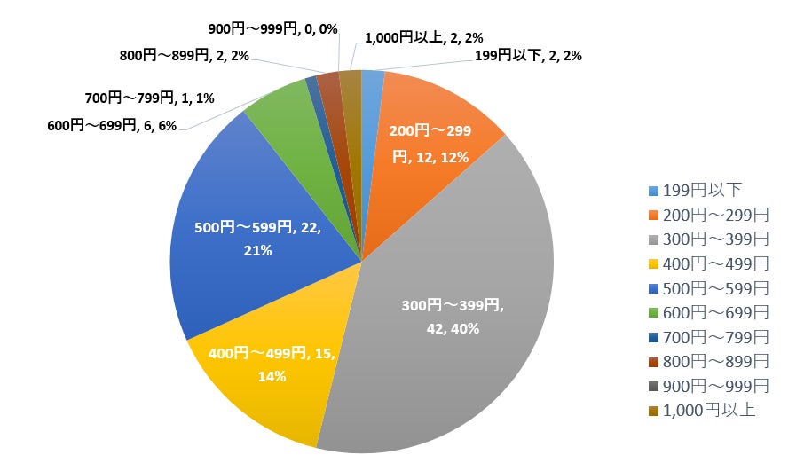 2018年の調査と比較すると、「300円~399円」が48.3%から40.4%に7.9%減少、「400円~499円」が11.5%から14.4%に3.9%増加、「500円~599円」が17.2%から21.2%に4%増加、「600円~699円」が4.6%から5.8%に1.2%増加と全体的に価格が上昇傾向にあることがわかりました。