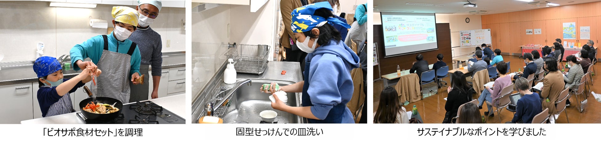 2022年4月からの育児・介護休業法改正にあわせて、父親と子どもの家事参加をテーマとして開催しました。親子で生活クラブのミールキット「ビオサポ食材セット」を調理・試食し、簡単・便利さ、おいしさを実感したのち、環境にやさしい生活クラブの固型石けんを使用した皿洗いを体験。続いて座学では、オンラインで繋いだ生産者から「ビオサポ食材セット」のおいしさの秘密や脱プラ対策といったサステイナブルなポイントを解説いただきました。