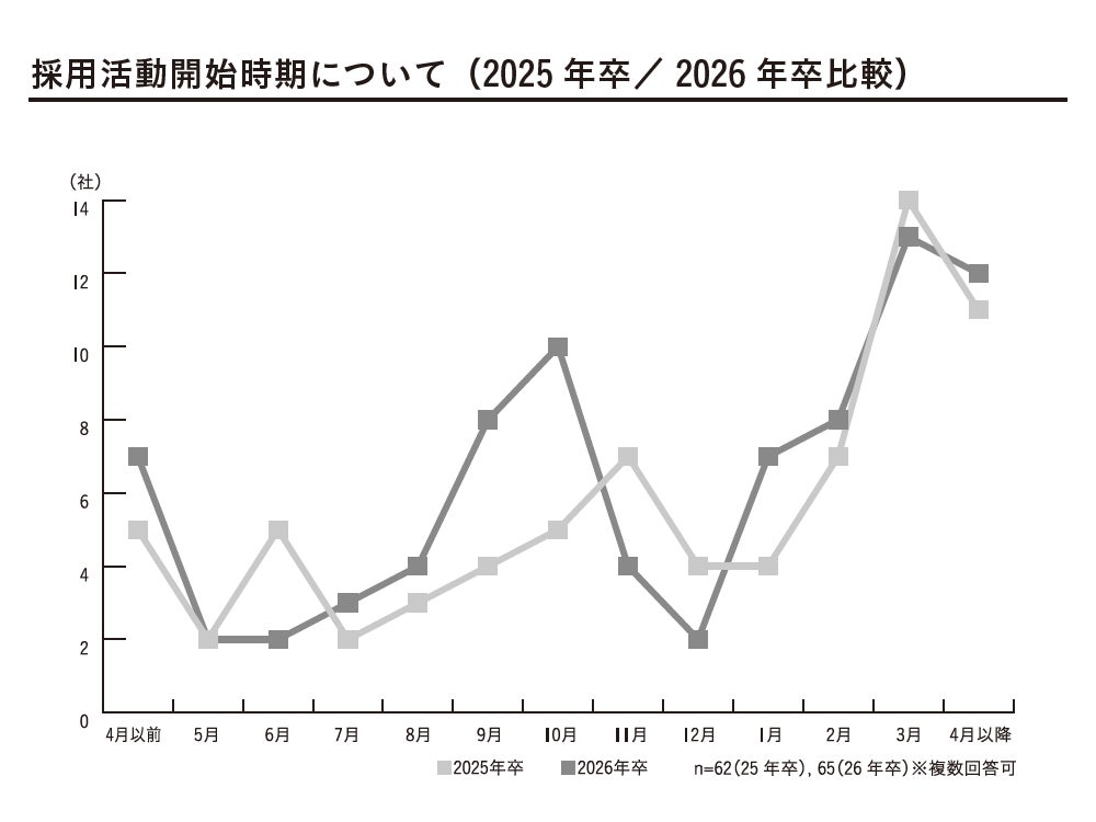 また各社の採用開始時期について調査すると、1カ月ほど前倒しとなっていることがわかりました。採用スケジュールは「(1)夏季インターンシップからの選考」「(2)秋冬インターンシップからの選考」「(3)本選考」の3つに大きく分類できますが、(2)のピークが11月から10月に、(3)のピークは3月と変わらないものの1,2月に前倒しする企業も現れています。