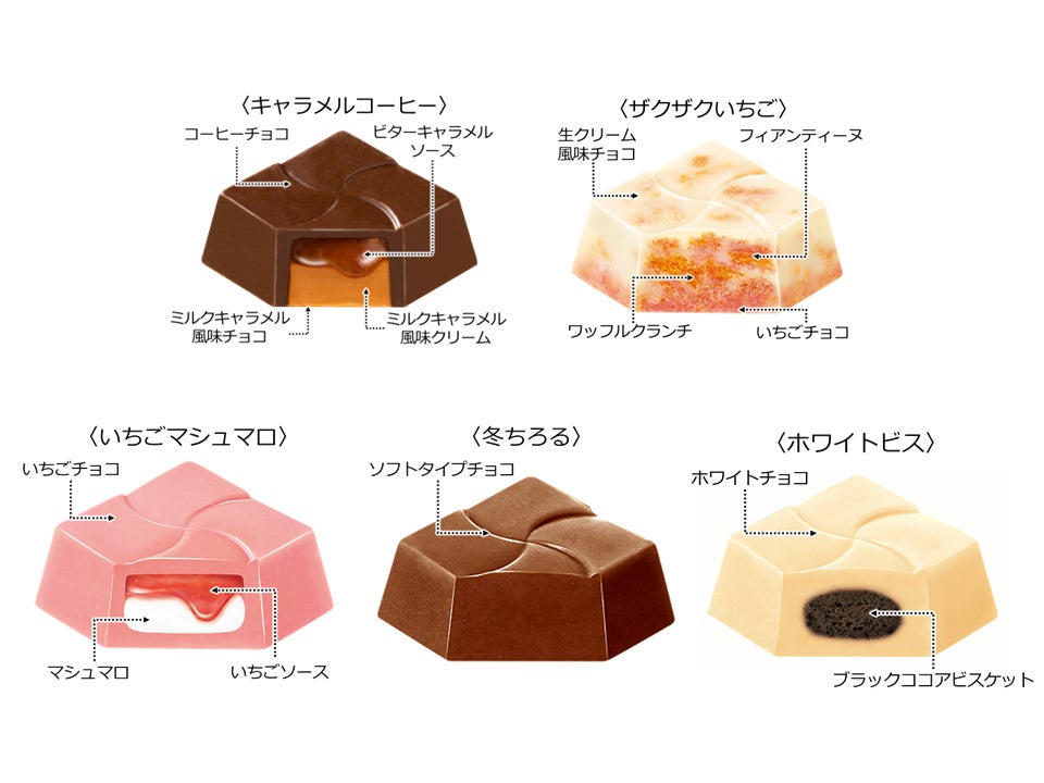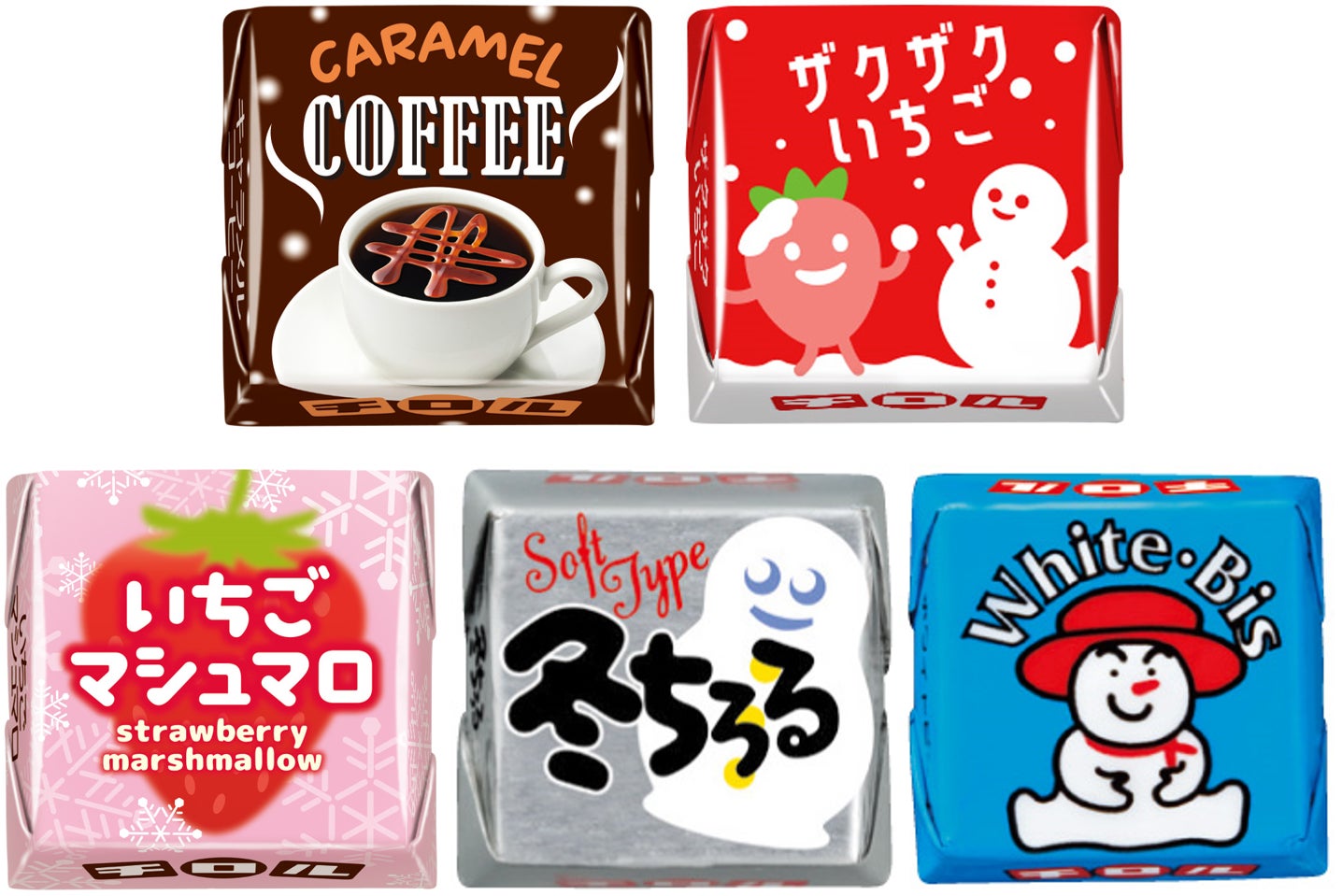 ご」に加え、冬ちろる・ホワイトビス・いちごマシュマロの全5種類が楽しめるアソート商品です。