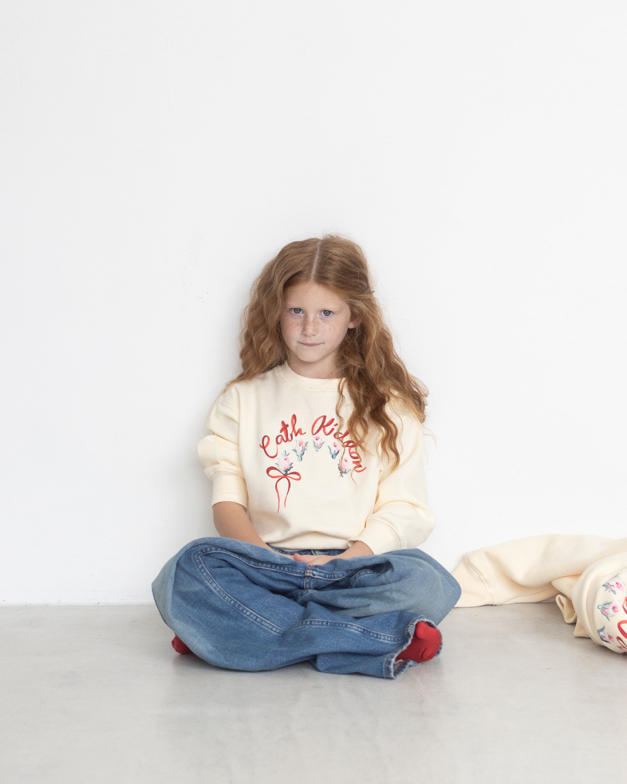 待望のキッズウェアはスウェットトップスが2つのデザインで登場。Cath Kidstonの日本再上陸以来、人気のアイコンRibbon Floralと、ローズ入りのレースハートを程よい厚みの裏起毛の生地に大胆にプリント。大きめのサイジングで丸みのあるシルエットを作り、かわいらしさを演出します。カラーはそれぞれアイボリー、ピンク、ブルーの3色展開。100~130サイズをご用意いたします。大人サイズのスウェットとドッグウェアとリンクしたデザインになっているので、親子や姉妹、家族お揃いでお召しいただけます。