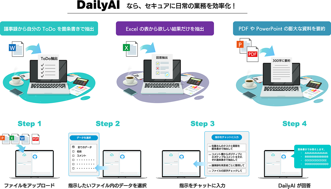 Excel、Word、PowerPoint、CSV、PDF、textのファイル形式に対応しており、DailyAIのWeb UIからファイルを直接アップロードすることで、そのファイルに対して生成AIの指示が行えます。ExcelとCSVは、分析したい列を指定することができ、例えばアンケートデータから傾向を分析したり、複数ファイルをアップロードすることで、ファイルを横断したクロス分析にも対応します。生成AIへ適切な依頼が出来るようにプロンプトのサンプル文を利用できる機能も提供します。このほか、会議の議事録データの要約、規約や仕様書等の誤字脱字チェック・修正、外国語への翻訳等、さまざまな用途に利用できます。