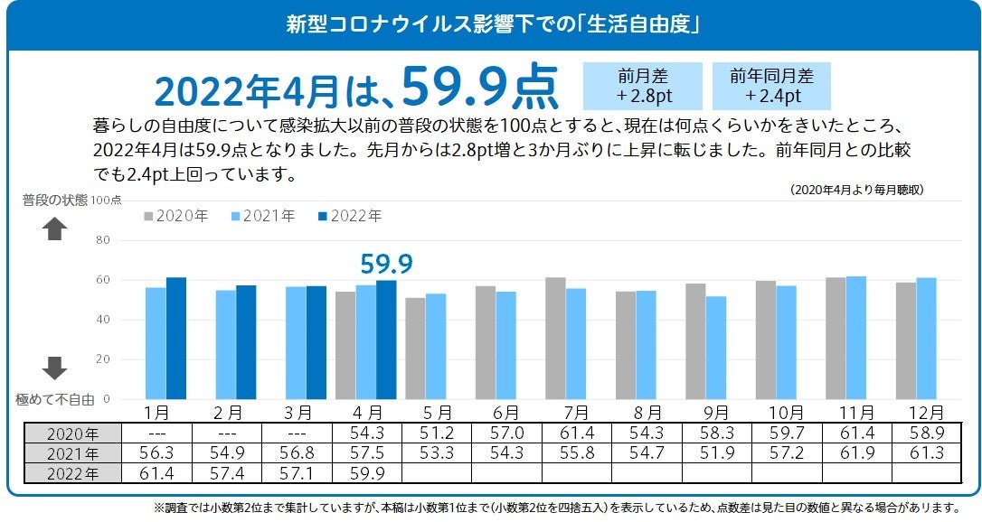| 4月の「生活自由度」は59.9点で、3か月ぶりに上昇。 「不安」も「行動の抑制」も緩む |