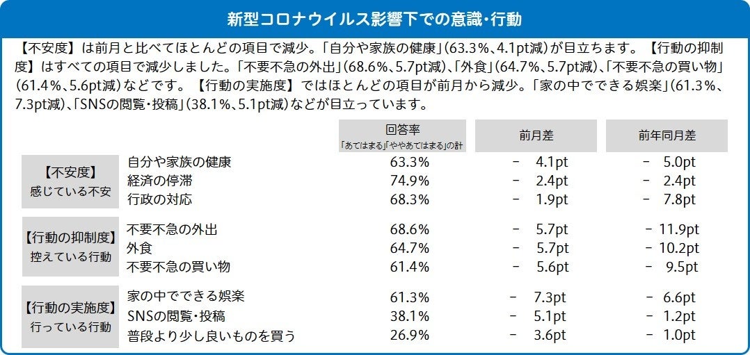 【調査前の状況】「まん延防止等重点措置」(東京や大阪など18都道府県対象)が3月21日までで全面解除され、約2か月半ぶりに適用地域がなくなりました。またロシアによるウクライナ侵攻の継続や、3月16日の福島県沖を震源とする地震の影響による大規模停電の発生など、コロナと異なる報道や話題が増加。その一方全国の新規感染者数は、 1週間平均で3月下旬に3.6万人台に減少したものの、再び増加し4月1日には4.3万人台となりました。新年度になり、社会活動活性化が模索される中での調査です。