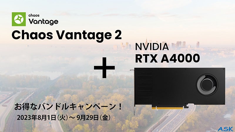 株式会社アスク(本社:東京都千代田区)は、2023年8月1日(火)~9月29日(金)の期間、Chaos社の「Chaos Vantage 2」とNVIDIA社製のプロフェッショナルグラフィックボード「NVIDIA RTX A4000」を、セットで特別価格にてご提供するバンドルキャンペーンを開催いたします。