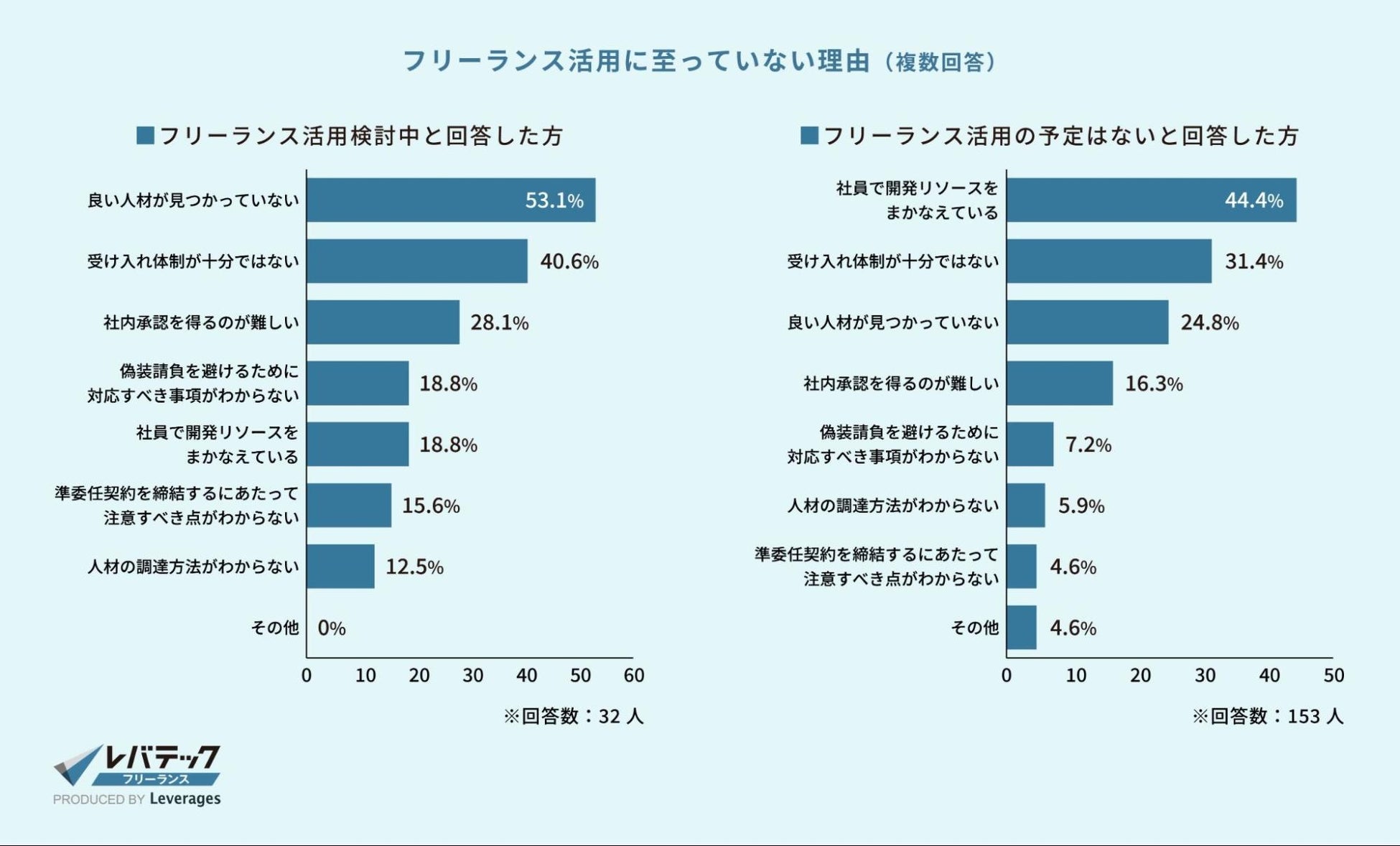 フリーランス活用を検討しているが活用に至っていない理由では、「良い人材が見つかっていない(53.1%)」が最多となり、ついで「受け入れ体制が十分ではない(40.6%)」「社内で承認を得るのが難しい(28.1%)」と続きます。
