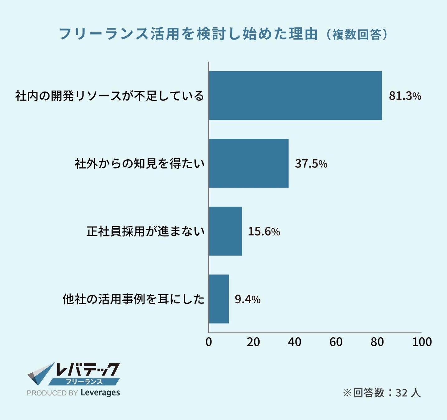 検討し始めた理由として最も多かったのは、「社内の開発リソースが不足している(81.3%)」となり、社内のIT人材不足を補うための一つの手段として、ITフリーランスの活用を検討している実態が見てとれます。