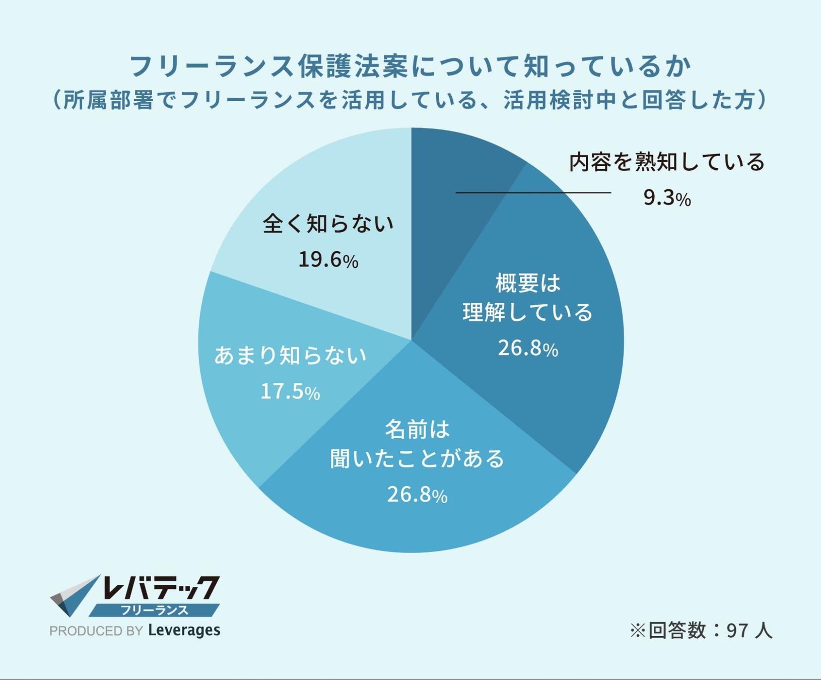 2023年2月24日に閣議決定されたフリーランス保護新法案について、全体の26.8%が「概要は理解している」と回答し、同じく26.8%が「名前は聞いたことがある」と回答しました。