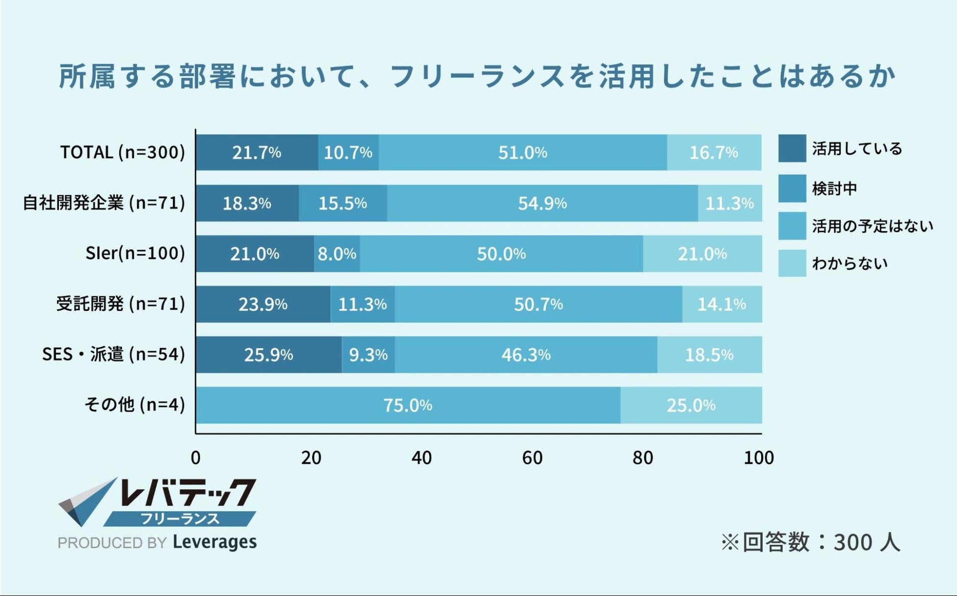 所属部署におけるフリーランス活用に関して、「活用している」と回答した企業は全体の21.7%、「検討中」と回答した企業は全体の10.7%でした。