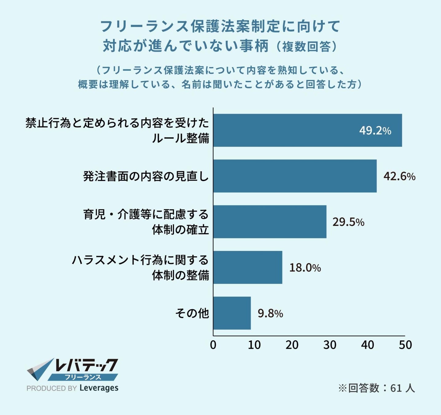 一方、対応が進んでいない事柄については、「禁止行為と定められる内容を受けたルール整備(49.2%)」「発注書面の内容の見直し(42.6%)」があげられています。
