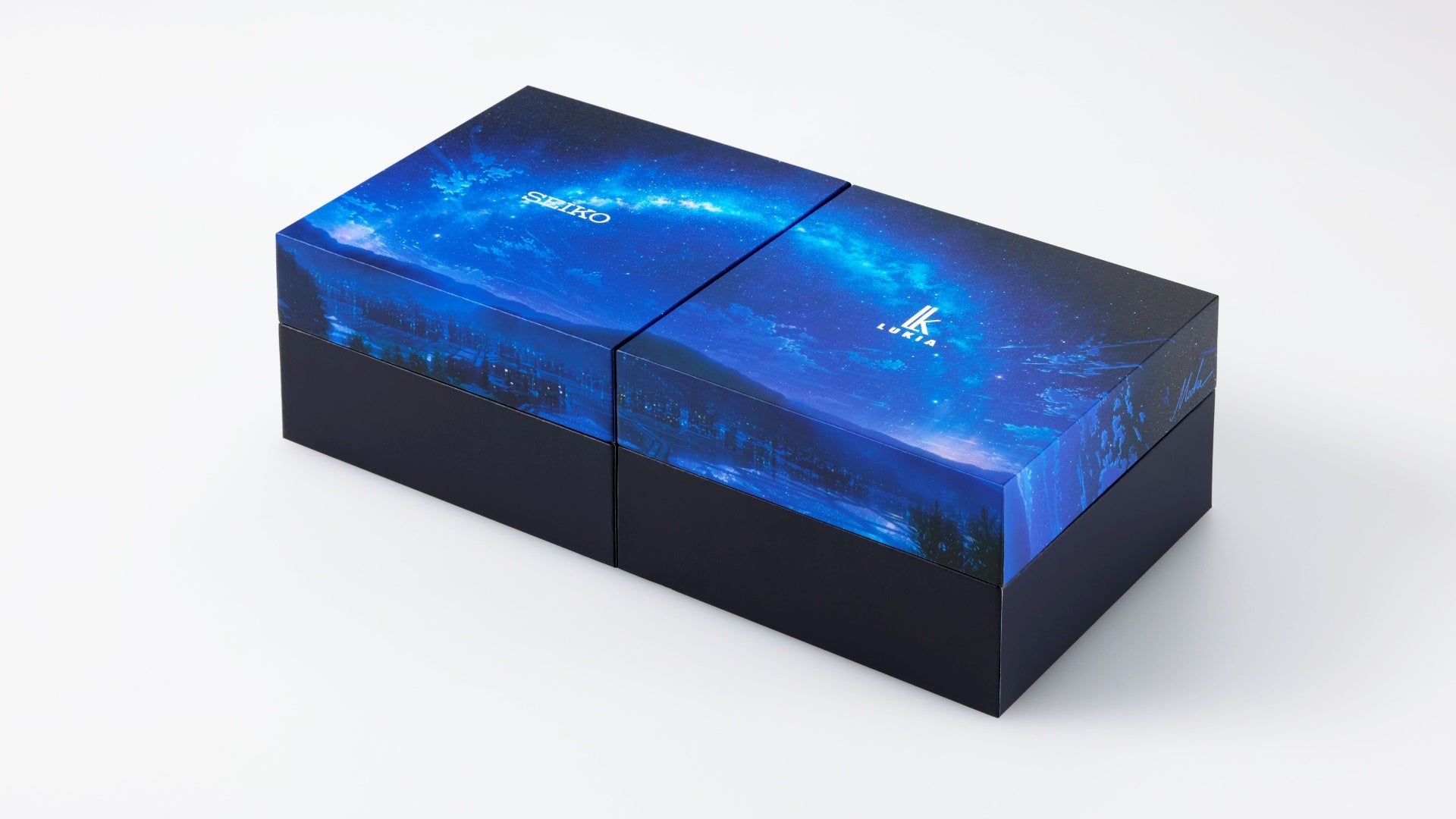 本モデルからインスピレーションを受けて人気イラストレーターmochaさんが描いた、美しい七夕の夜空と静寂に包まれた神秘的な自然風景を印刷したスペシャルボックスに収められており、自分へのご褒美や大切な人へのプレゼントにも最適です。ペアモデルのボックスを2つ並べるとイラストが完成する仕様となっています。