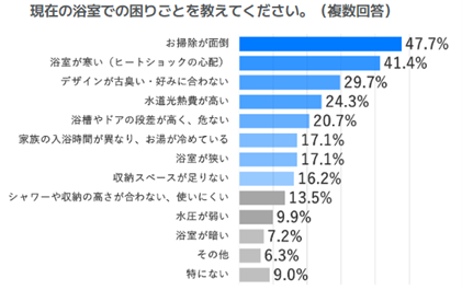 現在の浴室での困りごとについて質問したところ、「お掃除が面倒」が最も多く(47.7%)、次いで「浴室が寒い(ヒートショックの心配)」(41.4%)、「デザインが古臭い・好みに合わない」(29.7%)という回答となりました。家の中でも使用頻度の高いお風呂はカビや水あかなどの汚れも溜まりやすいため、掃除を面倒に感じる方が多いようです。