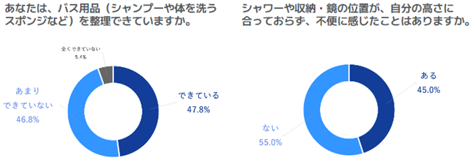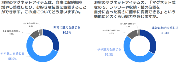 その他、毎日のお風呂の中で、52.2%と半数以上の方がバス用品(シャンプーやスポンジなど)を整理「できていない」と回答。シャワーや収納・鏡の位置については、45.0%が不便を感じたことがあることがわかりました。マグネットで自由に収納棚を増やしたり、好きな位置に設置できることに魅力を感じる方は、85.6%に及びました。