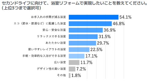 セカンドライフに向けて、浴室リフォームで実現したいことを聞いたところ、「お手入れの手間が減る浴室」と回答した方が最も多く(54.1%)、次いで「エコ(節水・節湯など)に配慮した浴室」(46.8%)、「安心・安全な浴室」(36.9%)となりました。困りごとやリフォームのきっかけの解決につながる「お手入れの手間の軽減」が上位なのは納得の結果です。また、2位の「エコ配慮」は、地球環境への配慮はもちろん、日々の暮らしに直結する水道光熱費の削減にもつながるため、重要なポイントであることが伺えます。