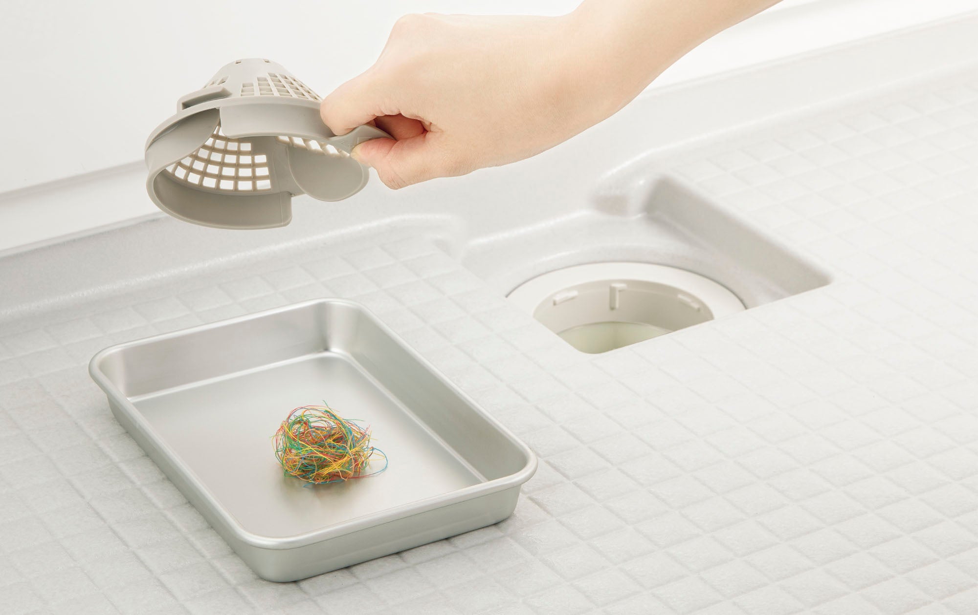 シャワーなどの排水を利用して、渦のチカラで髪の毛やゴミをパッとまとめます。渦でまとまったゴミをポイっとするだけの、お掃除がカンタンな排水口です。