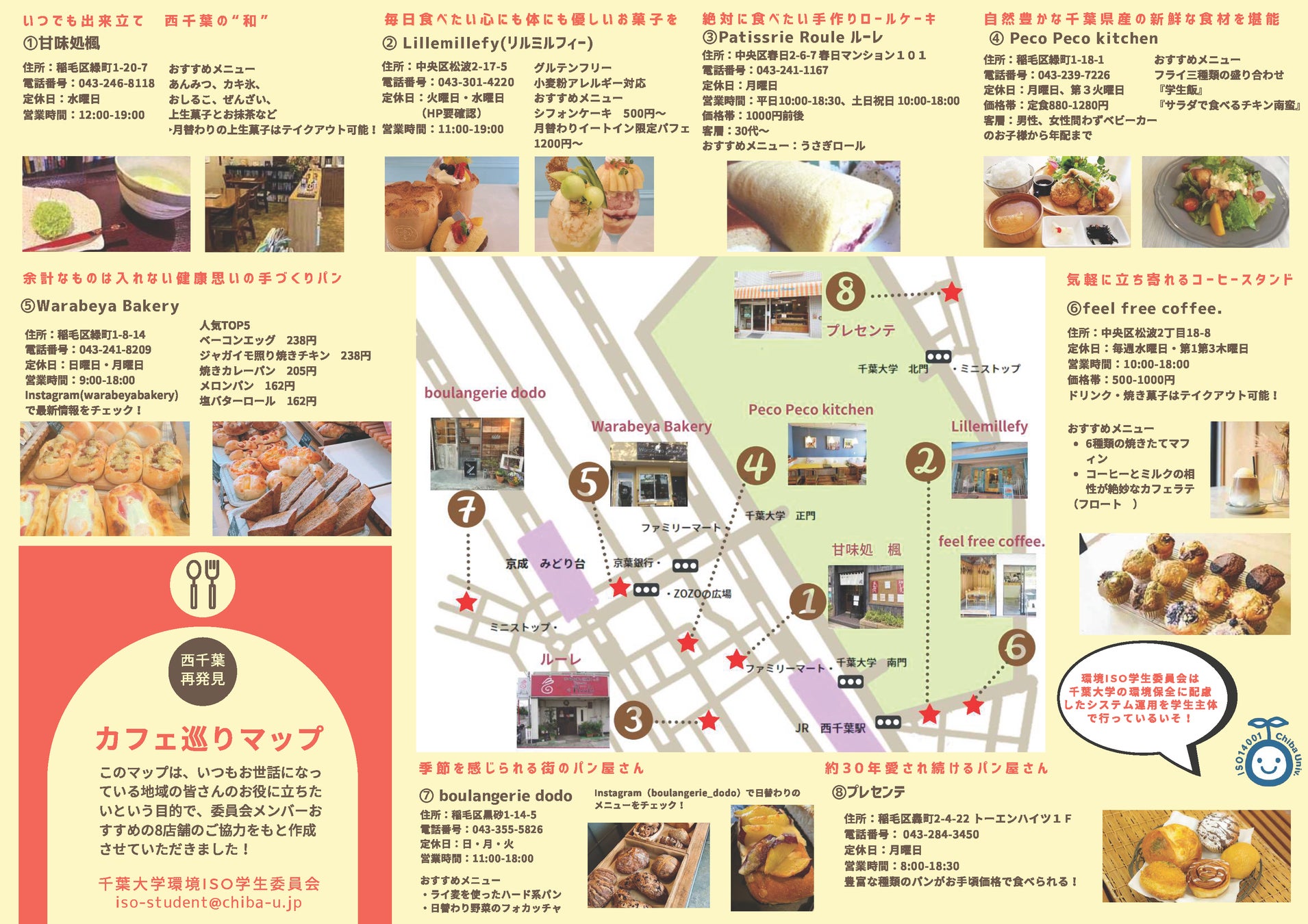千葉大学西千葉キャンパス周辺のカフェやパン屋などの情報をマップに掲載し、周辺自治会の回覧板やSNSを使って配布しました。
