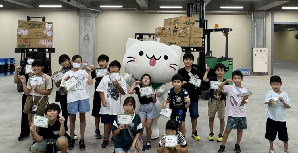 また、ベルーナ公式キャラクターの「べるーにゃ」も登場。終了後の集合写真の撮影やべるーにゃグッズのプレゼントなどで、「吉見LC物流出荷体験」を盛り上げることができました。
