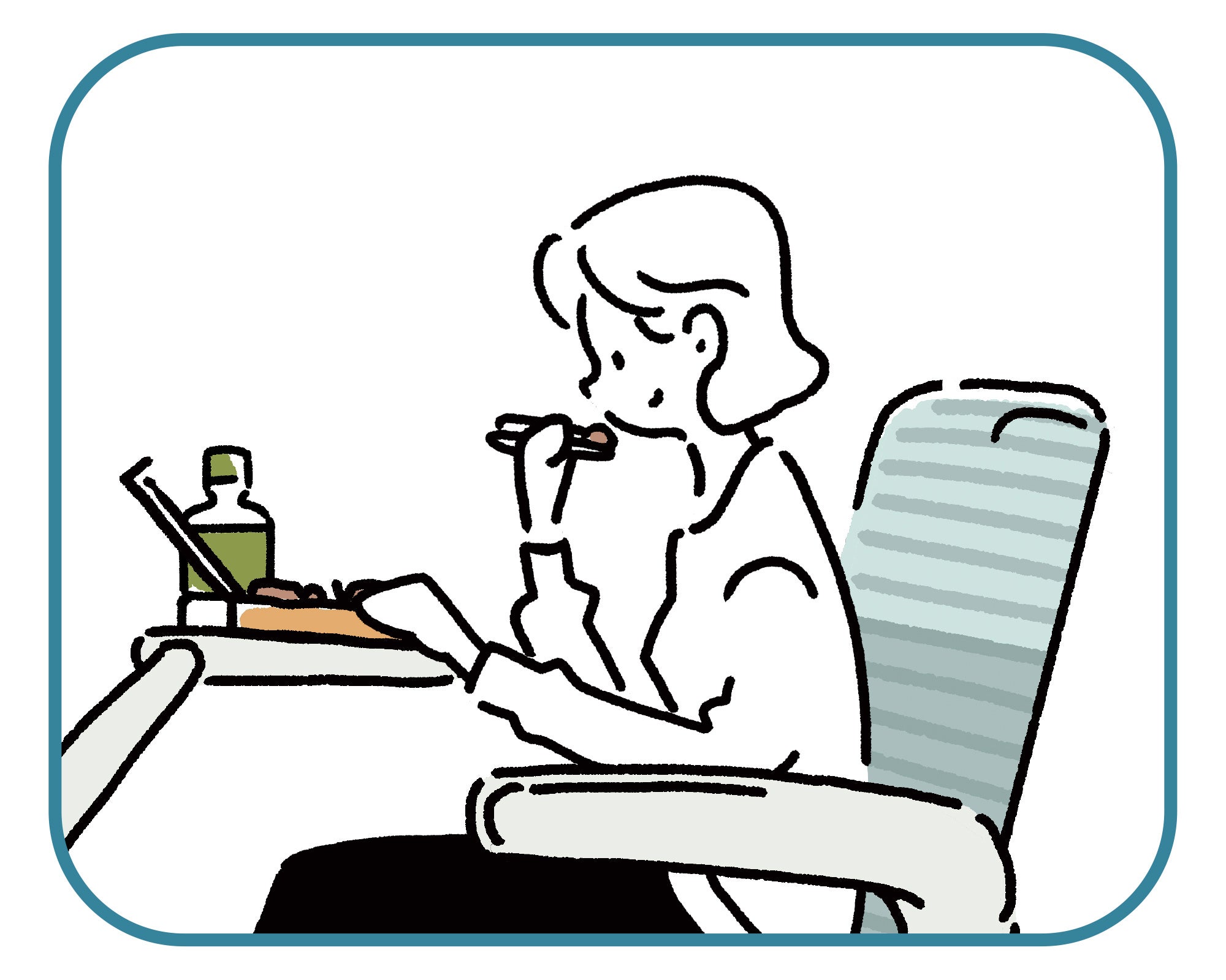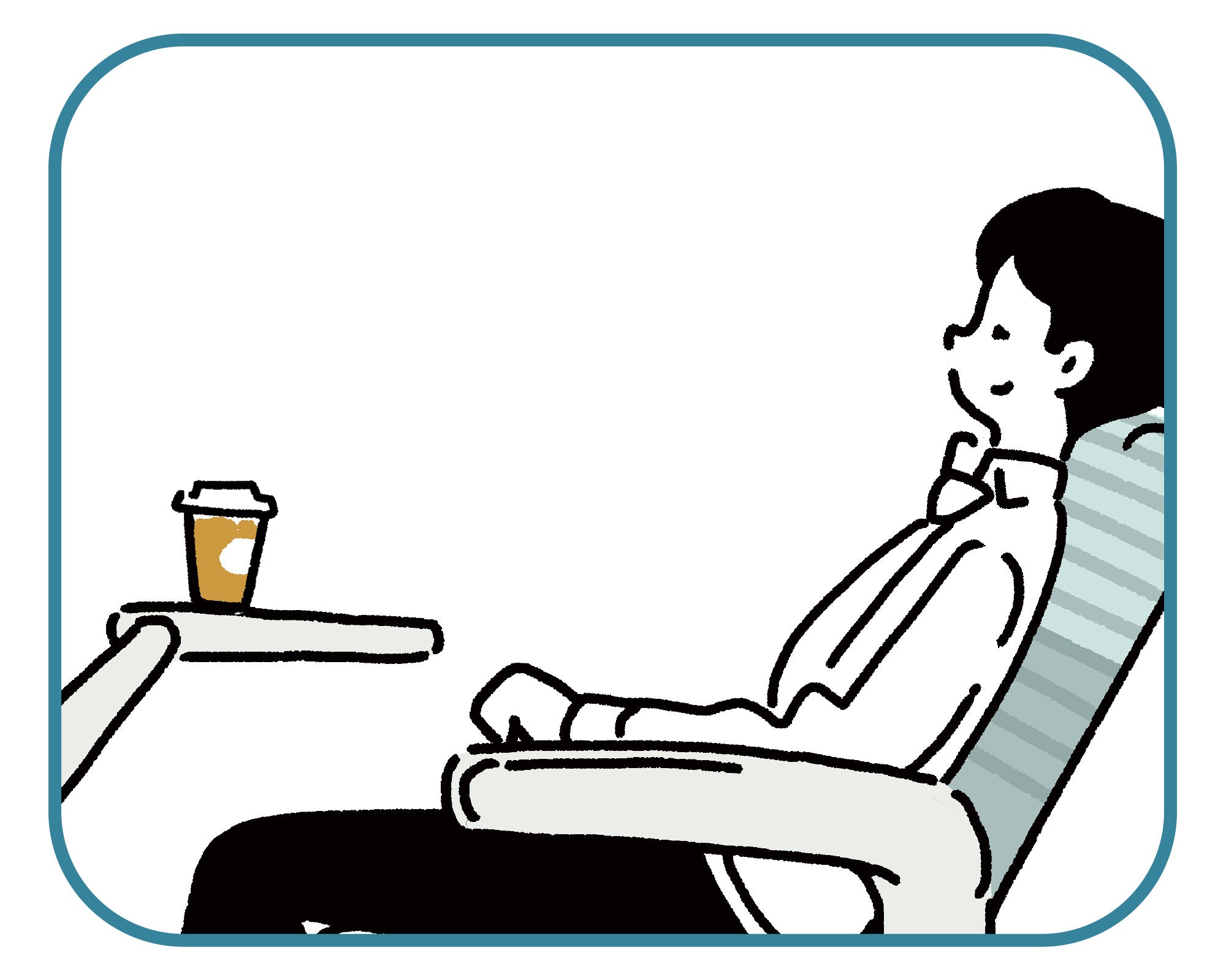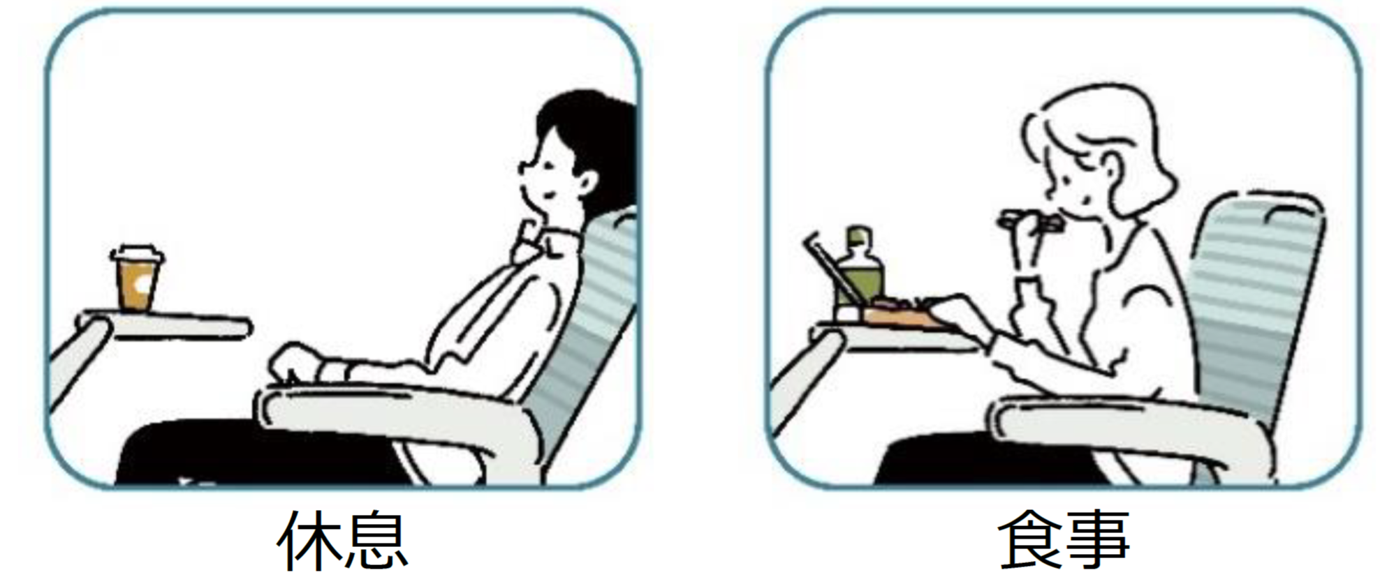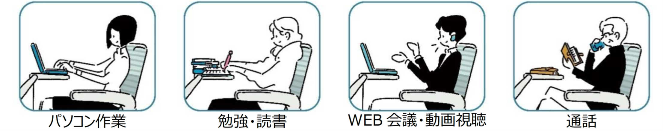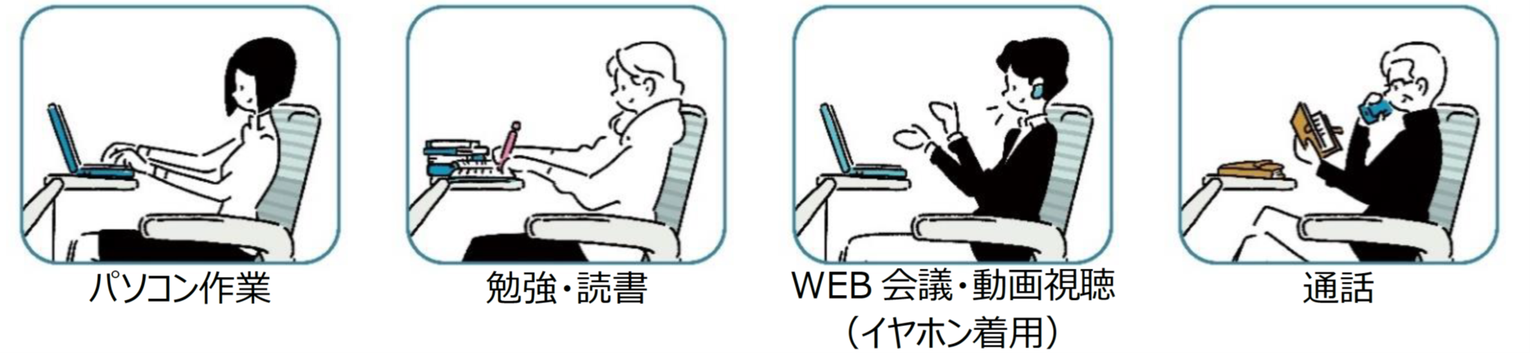 休息や食事など、仕事・勉強以外のお客さまもご利用いただけますが、仕事・勉強などをしやすい車内環境の維持のため、お客さま同士のご配慮をお願いいたします。