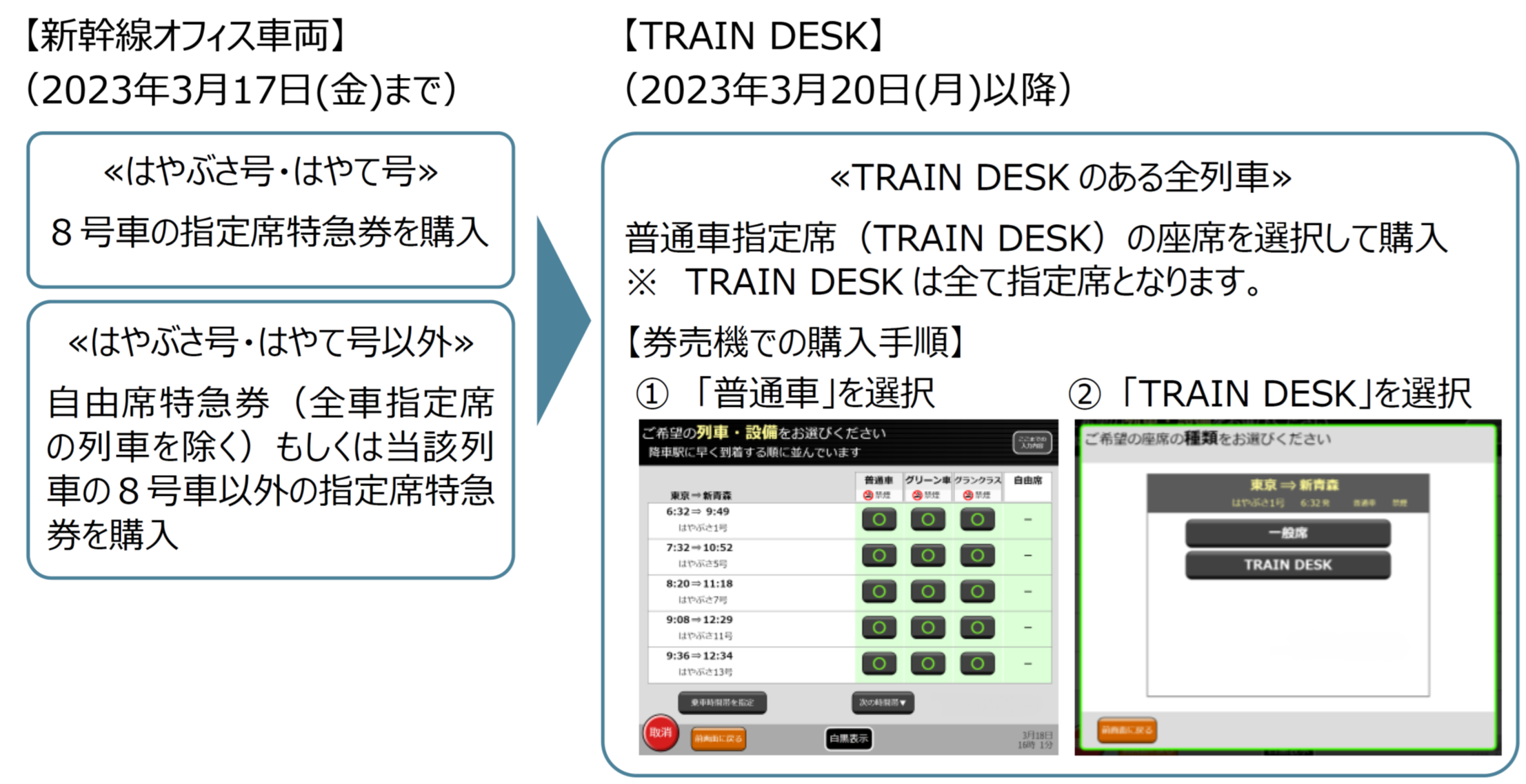 “新幹線オフィス車両”は、3月20日より“TRAIN DESK”にリニューアルし、設定する列車全てで指定席としてサービス開始します