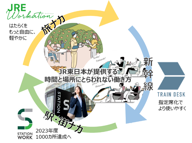 JR東日本は、ヒトを起点とした暮らしの創出に取り組むべく、TRAIN DESK、STATION WORKに加え、空間自在ワークプレイスサービスやJREワーケーションといった移動前後の駅・街ナカ、旅ナカにおける多様な働き方・くらし方を実現する取り組みをあわせて展開していきます。