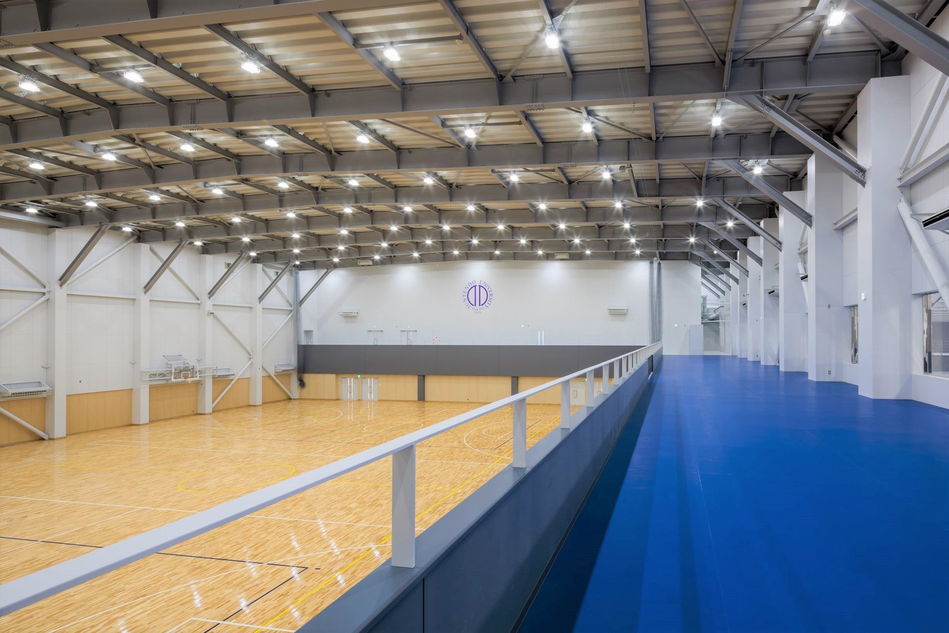 バスケットボールコート(2面)、バレーボールコート(2面)、ハンドボールコート(1面)を設置しました。有効天井高12.0m以上を確保しており、バレーボールコートの国際基準に準拠しています。2階ギャラリーは、ウォーミンアップや仮設観客席の設置等フレキシブルに使えるフリースペースとなっています。