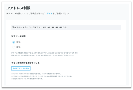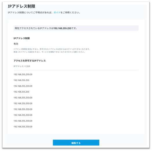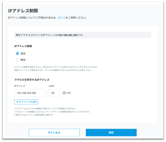 ※「確認」ボタンより、アクセスを許可したIPアドレスの確認が可能です