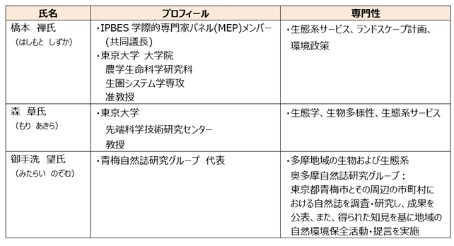 「つなぐ森」において、生物多様性に関する国際・国内ガイドラインの推奨項目充足を目的に、産学連携や他セクターとの共創を図ってまいります。このたび、生物多様性に関して専門性を有する大学・奥多摩地域の環境団体等から、3名の有識者の方に「森を、つなぐ」東京プロジェクト 生物多様性有識者会議に参画いただきました。