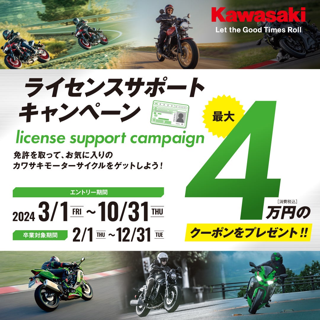 株式会社カワサキモータースジャパン(本社:兵庫県明石市、代表取締役社長:桐野 英子)は、パートナースクール(指定教習所)を卒業後、カワサキ正規取扱店でご利用可能な新車購入サポートクーポンがもらえる「ライセンスサポートキャンペーン」を2024年3月1日(金)より実施いたします。