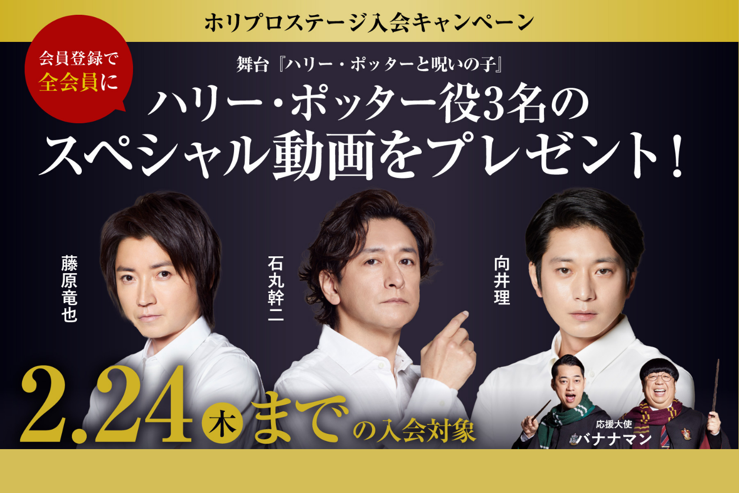 現在、ホリプロステージでは会員登録キャンペーンを実施中! 誰でも簡単に無料で会員登録ができ、登録した方にはもれなく【ハリー・ポッター役3名のスペシャル動画】をプレゼント。プレビュー公演チケットは、2月23日(水・祝)午前10時より先着順での販売のため、事前の会員登録をお忘れなく!