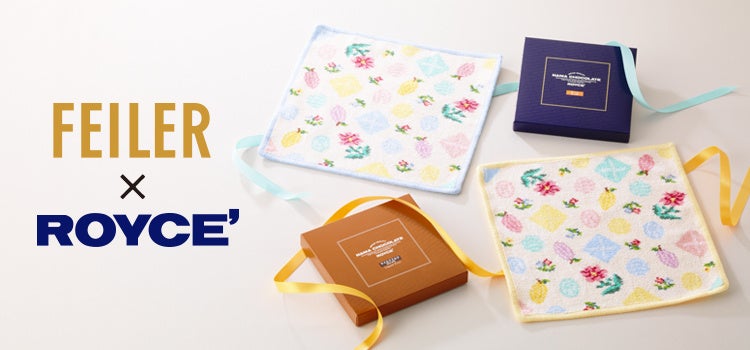 ドイツ東部にあるホーエンベルクが発祥のライフスタイルブランドFEILER(フェイラー)と、ロイズがコラボレーションし、ロイズの人気商品などをデザインした、オリジナルのハンカチが登場。ロイズの生チョコレートと組み合わせた、ロイズ創業40周年記念の特別なセットをご用意しました。ハンカチのカラーと生チョコレートの味わいが異なるセットを、2種類販売中です。